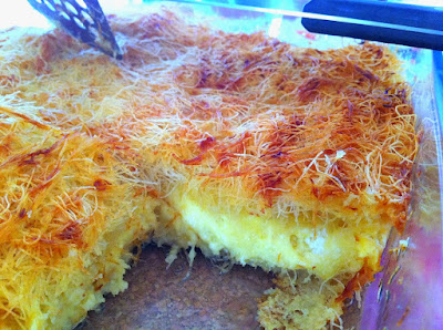 2. Ρίχνουμε το μισό βούτυρο λιωμένο .Ρίχνουμε τα τυριά που τρίψαμε και ανακατέψαμε .Βάζουμε το υπόλοιπο καταίφι και το υπόλοιπο βούτυρο.